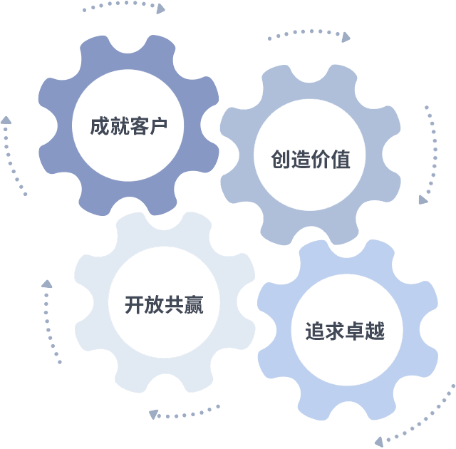 成就客户是一切决策的出发点,,,创造价值是衡量所有工作的标准,,,,追求卓越是我们做事做人的态度,,,,开放共赢是我们的格局也是最终的结果。。价值观的齿轮环环相扣,,推动着组织里的每个人不断向前。。